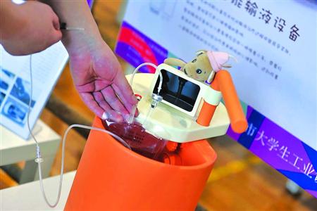 在昨天大賽現(xiàn)場(chǎng),一款橙黃色的兒童智能輸液設(shè)備引來(lái)了很多觀眾的關(guān)注。這套兒童智能輸液設(shè)備被設(shè)計(jì)成一個(gè)小推車的形狀,該參賽項(xiàng)目的指導(dǎo)老師、上理工工業(yè)設(shè)計(jì)專業(yè)副教授施瀚介紹,這個(gè)項(xiàng)目的設(shè)計(jì)者去醫(yī)院調(diào)研時(shí),發(fā)現(xiàn)患兒長(zhǎng)時(shí)間輸液會(huì)產(chǎn)生緊張、孤獨(dú)、害怕等不良情緒,因此發(fā)明了這個(gè)可移動(dòng)的小推車?;純涸谳斠簳r(shí)可以坐在小推車上,并且可以像在家中一樣,推著小車、帶著玩具四處走動(dòng),給治療帶來(lái)積極的心理影響。